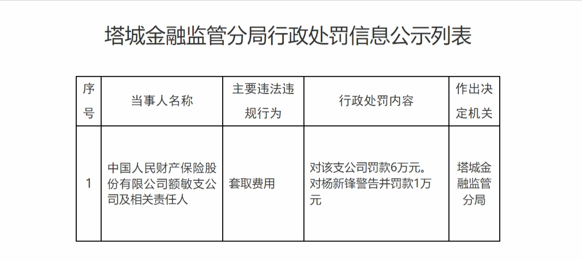 1月19日,塔城金融监管分局行政处罚信息公示列表显示,中国人民财产保险股份有限公司额敏支公司大资本优配,套取费用,被罚款6万元;责任人杨新锋被警告并罚款1万元。